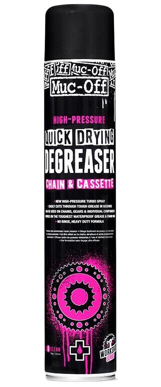 - New high-pressure turbo spray- Easily cuts through tough grease in seconds- No rinse, heavy duty formula- Can be used on chains, gears and individual components- Works on tough waterproof grease and chain wax
