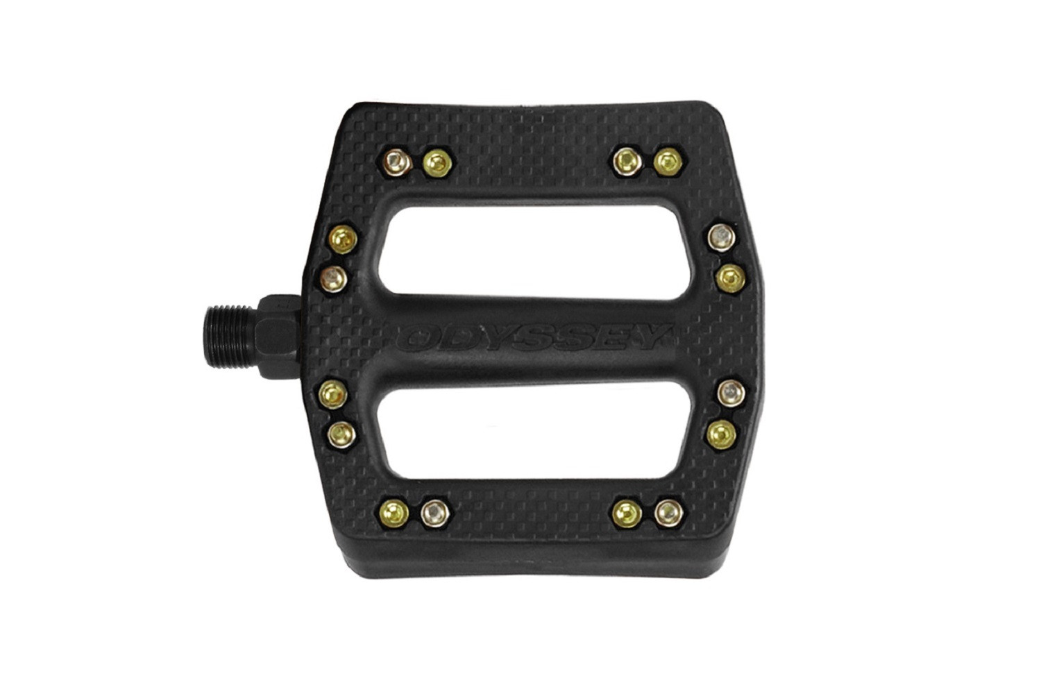 A huge leap forward in pedal technology that results in a simpler overall design. Extremely lightweight plastic bodies eliminate the need for bearings and allow for a spindle that is significantly stronger than normal. Metal pins make the pedal very grippy, and the pedal will still function normally when pins are removed from one side for grind tricks. No flimsy outboard end caps. Pedal body halves are easy and inexpensive to replace – instead of replacing the whole pedal.