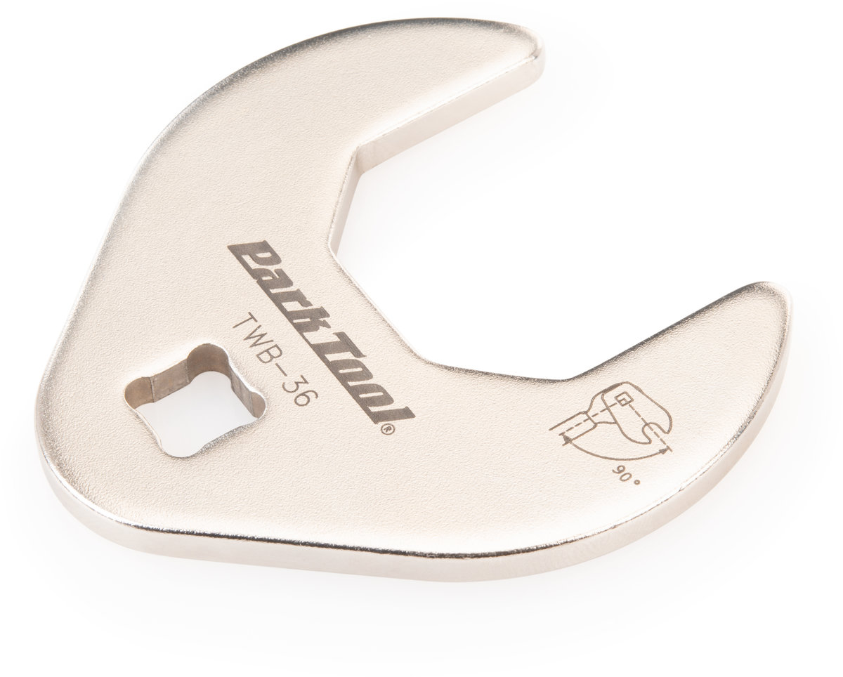 The TWB-36 is a crow foot style wrench used with any 3/8-inch drive torque wrench and drive tools with 36mm wrench flats such as Park Tool LRT-2, LRT-3, LRT-4 and BBT-18 to verify components are torqued to the correct specification. Constructed from heat-treated 4130 laser-cut steel and plated for long life.