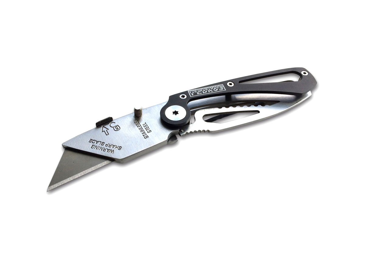This compact folding utility knife will quickly find a home in your pack, in the shop, or at home. Stainless and aluminum construction provide a balance of low weight and durability, ready for years of daily use. Easily operable with one hand the folding design locks open during use and folds to half its size, perfect in a pocket or clipped to a belt, always ready for the next job. Standard replaceable blades are easy to find at your local hardware store.